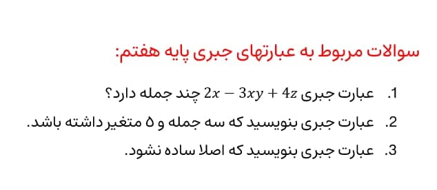 سوالات مرتبط با درک مفهوم عبارت جبری برای دانش آموزان