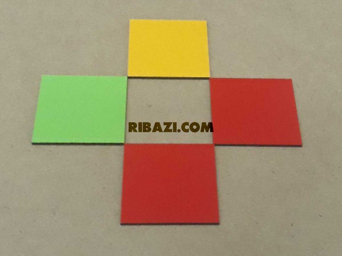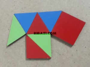 - تصویر زیر را با ابزار کیت آموزشی ریبازی بسازید و سپس بگویید اگر دورتادور این شکل را خط بکشیم چند ضلع از اشکال هندسی داخل تصویر در به دست آوردن محیط موثر نیستند. اگر مربع ها با هم برابر باشند و اندازه ضلع مربع سبز رنگ 4 سانتی متر باشد محیط این تصویر را به دست آورید.